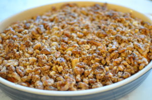 7. Add the crumbly nuts along with the whole nuts into a bowl. Add the rest of the topping ingredients and mix. Once mixed put on top of the sweet potato filling.
