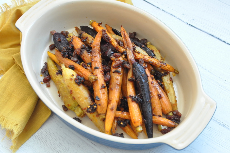 One of my favorite condiments is chili oil. Trader Joes’ new Chili Onion Crisp is a favorite on almost anything, or even better my homemade Chile Oil. But when paired with honey to make an amazing glaze it is a game changer! Paired with homemade pickled raisins, this carrot dish is sure to bring the sweets and heat! It is a perfect throw together side dish during your quarantine!