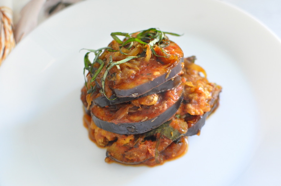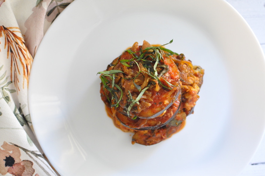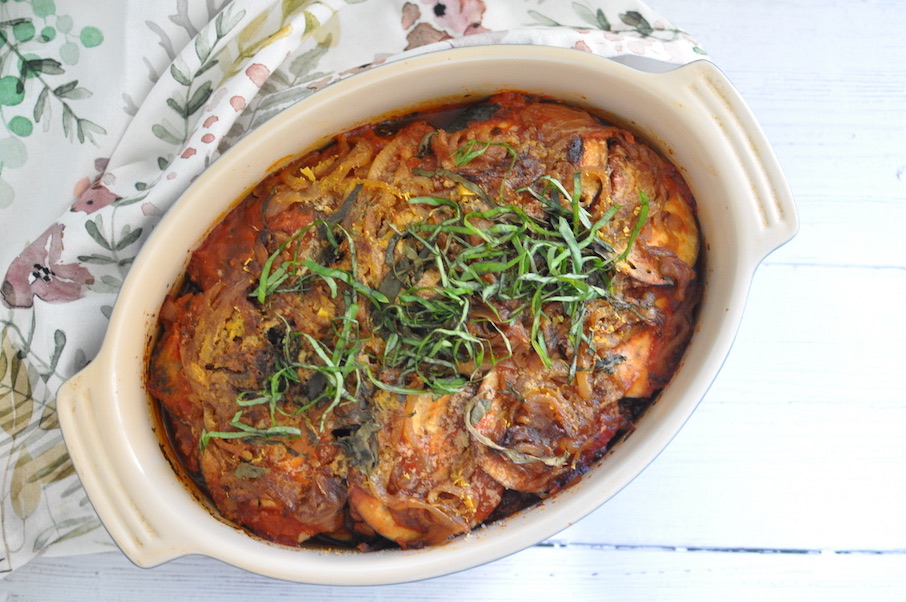 - Start with eggplant, 1 tsp Italian seasoning, ½ tsp Chili Flakes, ¾ cup marinara, Caramelized onions to coat, 1 TB nutritional yeast, and sprinkle of chiffonade basil. Repeat this until you are out of ingredients.