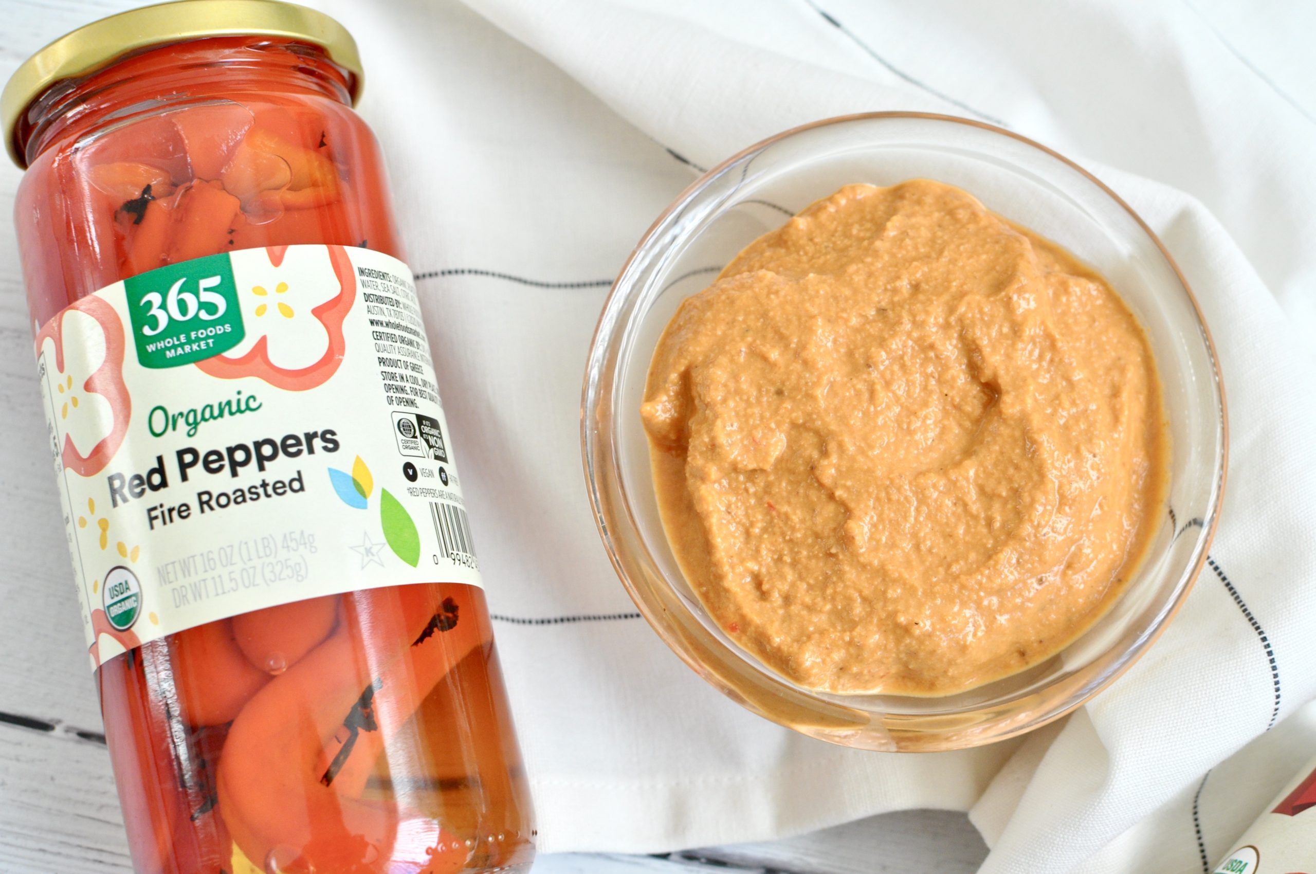 Drain roasted red peppers from their liquid and add to the blender.