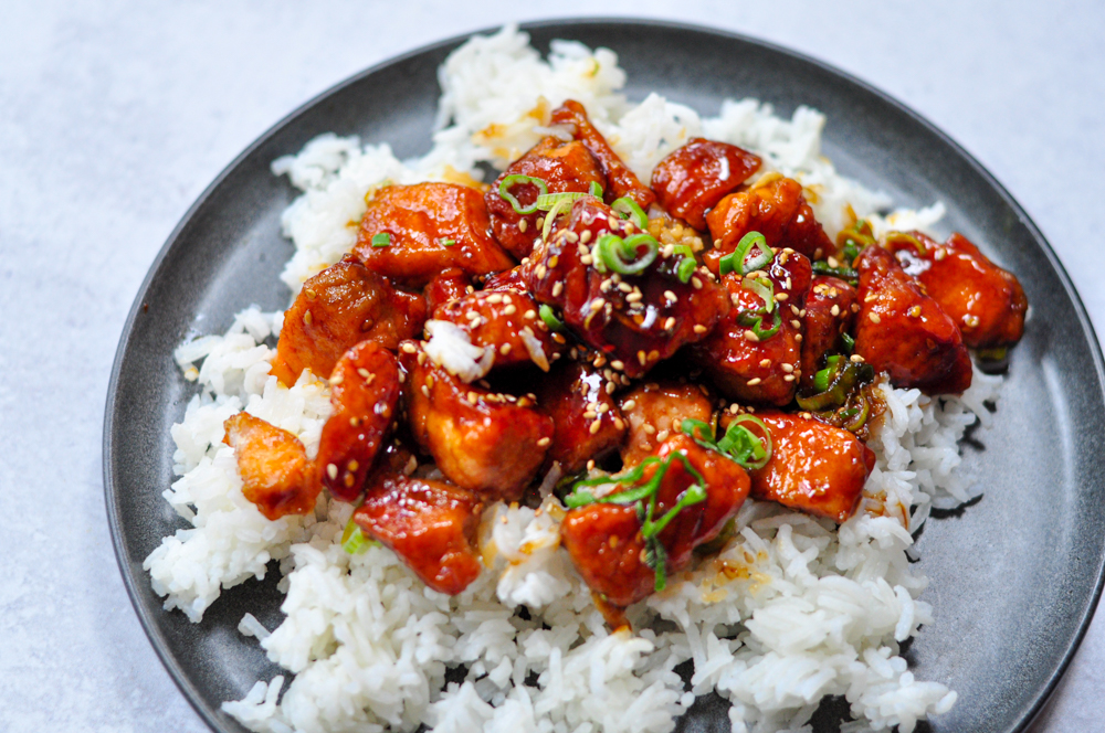 In a nonstick pan or wok over medium heat, add avocado oil. Once hot, add the salmon in an even layer and cook for 3 minutes until golden brown, flip over and cook another, 3 minutes.