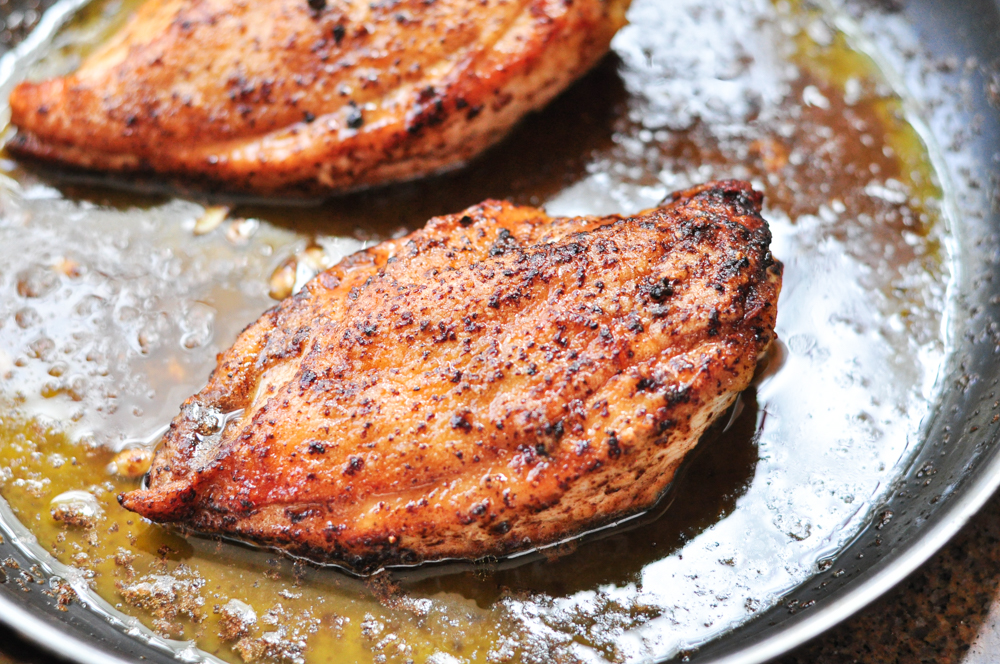 Turn the heat to medium and add two tablespoons of butter. Baste the chicken with the butter and cook for another 3-5 minutes, until the chicken is cooked through or reads 155*F on a meat thermometer.