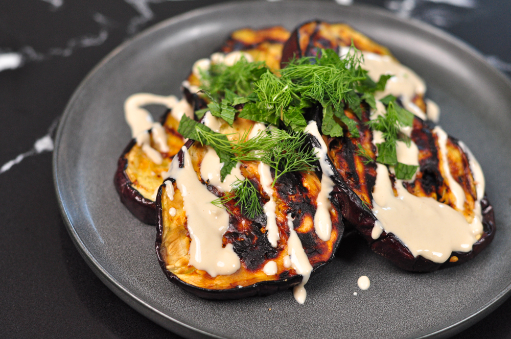 Drizzle the sauce over the grilled eggplant and garnish with herbs. Enjoy!