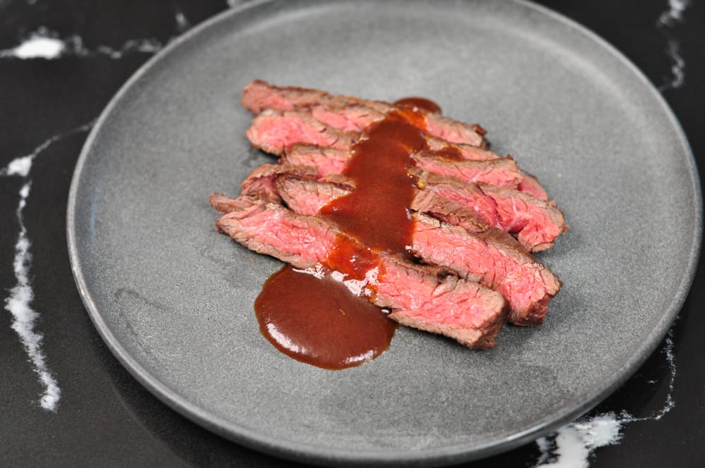 A skirt steak is a long, thin, and flavorful cut of beef that comes from the plate section of the cow, located near the belly. It has a distinctively coarse grain and is known for its rich, beefy flavor. While not as tender as some other cuts, skirt steak is prized for its intense flavor and is often used in dishes like fajitas, stir fry, on top of salads. Because it isn’t as tender, a marination is perfect for this cut of steak.